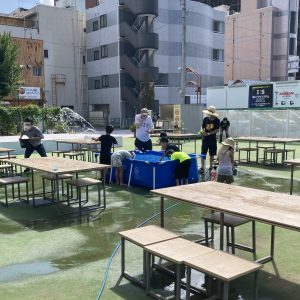 まえばし「勝手に」水合戦が小規模で開催された。私は受付のお手伝い。レクリエーション保険料200円をいただいてあとは大人も子供もずぶ濡れになってはしゃぐだけ。