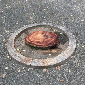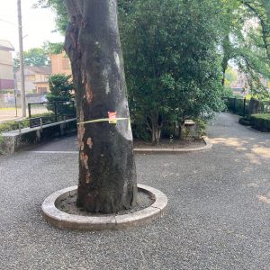 千代田町3丁目、広瀬川沿いのグランビル前橋の前。伐採された欅。木の子が生えていたこともあり樹木医の診断を受け、倒木の危険ありとのことで緊急伐採となったようだ。8月11日の日に伐採された。