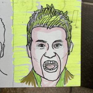 私とは前職のまえばしCITYエフエムの時からの付き合いなのでかれこれ10年近くになる。以前は毎日短歌を書きまくっていてそれを発表できる場所を探していた。5000詩以上書き上げたということで今度は似顔絵を描きまくっている。通り過ぎる人に呼びかけて似顔絵を描く。