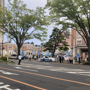 そのまま県庁前へ。あびこてつ総決起集会で激励を。