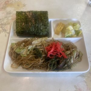 これぞ日本食の塊です。おにぎり、焼きそば、お漬物(写真には入っていませんが卵スープもついています)のワンプレート!