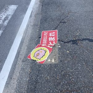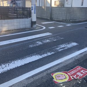前橋市のゆるキャラころとんのイラストと共に「わたるまえにいちどとまれ」と書かれた路辺表示が剥がれていました。逆にこの上で滑ってしまいそうな感じになっていますし横断歩道の表示も薄くなってきています。