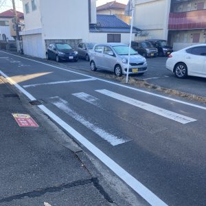 そのひとつ東側の横断歩道は「わたるまえにいちどとまれ」の表示は大丈夫でしたが横断歩道自体の路面表示がかなり薄くなっています。