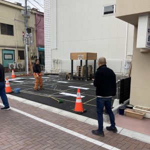 サイトウアケミさんがアスファルトに下地をペイントしていました。まちびらきではここにチョークアートが施される様です。