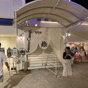 今回のお目当てのひとつと言っても良いサウナです。サウナキャンプさん主催のテントサウナで、既存のプールの更衣室などを活用し、本来ならデッドスペースになってしまいそうな部分にテントサウナと水風呂を設置して遊園地をみながら整えるという面白い環境でした。