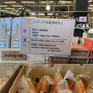 ハッピーモア市場の野菜表示があり、オーガニックとそうじゃないものをおくのが特徴。商品のバーコードに色分けでわかり安くなっている。商品に値段だけじゃない選択肢を与えていて、お客さんがJASマークよりハッピーモアの赤いマークを優先しているという。加工品はお客さんが求めてる オーガニックなものを全国からセレクトしている。