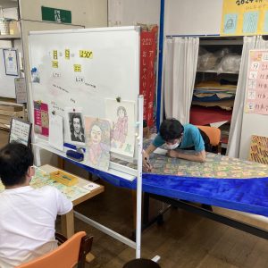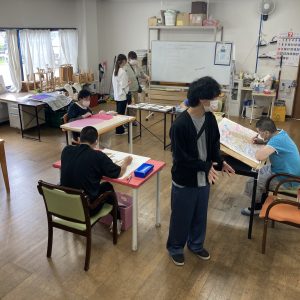 皆さん個性あふれる才能で輝いています。できること、得意なことに合わせて職員の方々が知恵を絞って寄り添っていました。仕事として大きな作品に取り掛かっている方や商品を作っている方などバラバラですが、まさにみんな違ってみんな良いという言葉がぴったりでした。