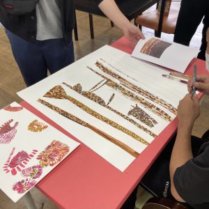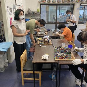 一人ひとりが当たり前に生きていくために、どんなに重い障害があっても「働くことは権利」だと位置付け、一人ひとりにあった労働を模索し続けてきたということでした。当初は缶プレスやウエス(機械の油拭き用布)作りの仕事が主流でしたが、現在は絵画、織り、ステンドグラスなどの表現活動へと幅が広がっています。班に分かれてそれぞれ取り組んでいます。