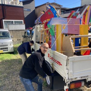 スケジュールを調整して午前中に駅家の木馬祭りの子木馬を移動させます。いつもは軽トラなのですが今回はレンタカーなので少し大きいトラックを借りて現場へ。