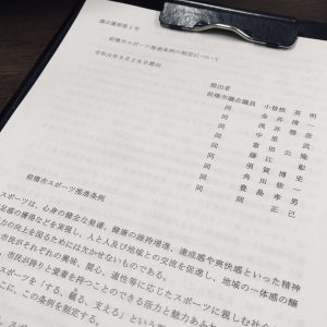 上程議案は全て賛成多数または全員賛成で可決となった。今回特徴的だったのが議会議案の上程があった点。私が議員になってから初めて議会から議案が上程された。議会議案第1号として「前橋市スポーツ推進条例の制定」が上程され説明があり、全員賛成での可決となった。