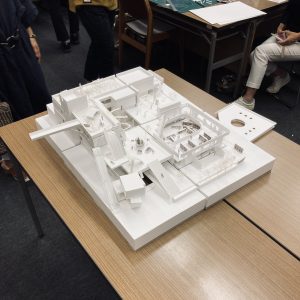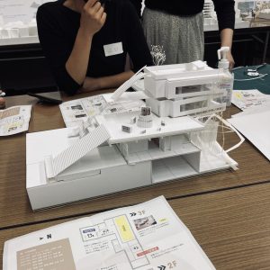 現在の図書館の模型を大胆に4分割して各班ごとにどういう建物であればもっと居心地が良く、人と人とが関われるののかを考えながら実際に模型をどんどん変形させていく。